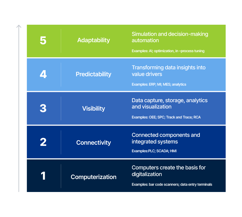 Knowing where you are is the first step to getting to where you want to be. Thatʼs why we have adopted the Digital Maturity Model. It places operational technologies onto a continuum, providing context and structure that allows for thoughtful planning to meet your organizationʼs unique goals and operational requirements.